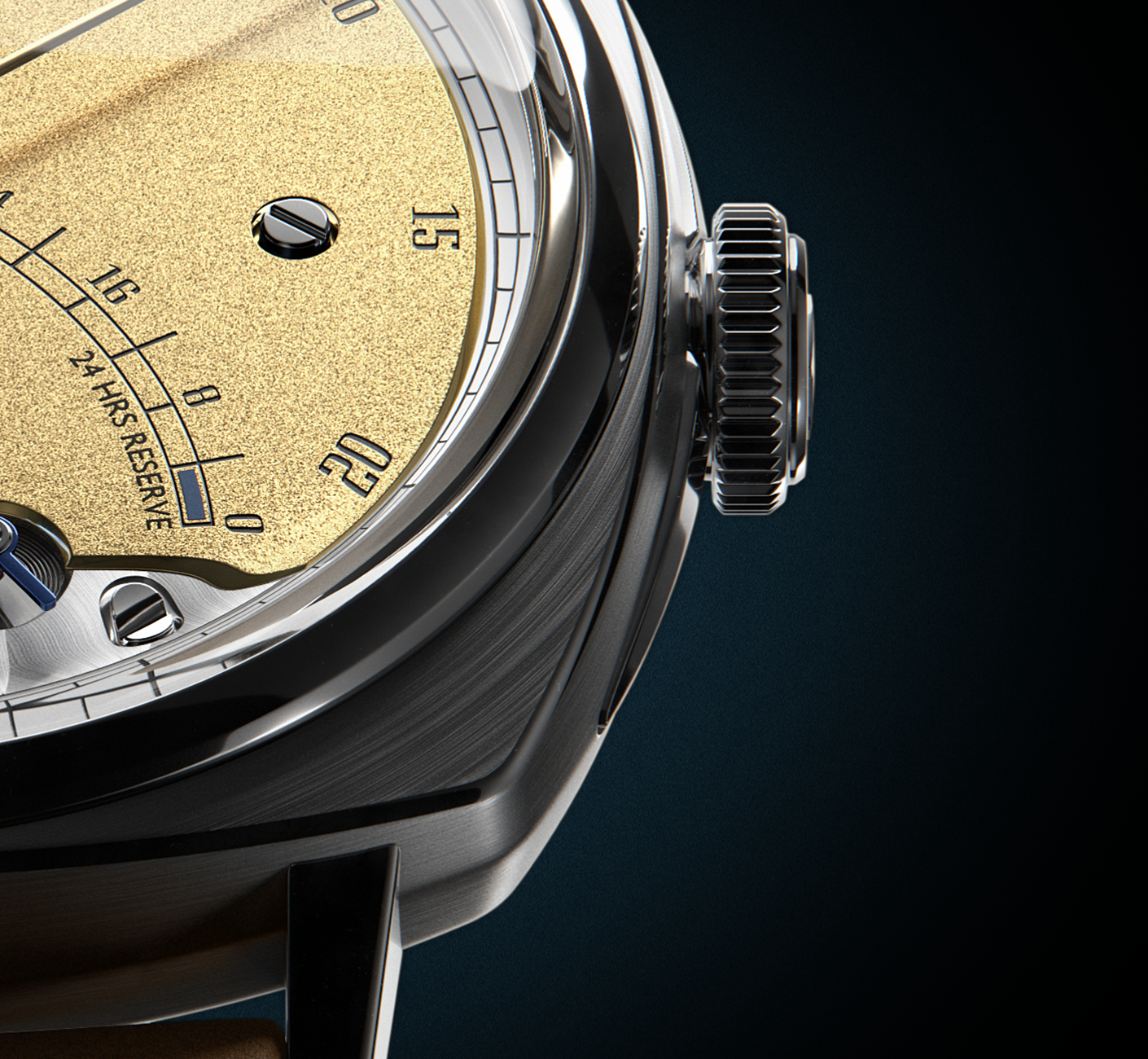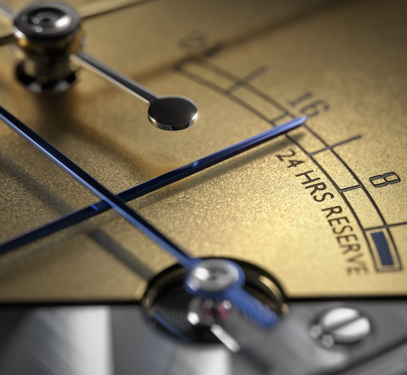 - 7-day power-reserve indicator with special double retrograde, non-linear display (6 days + last 24 hours)